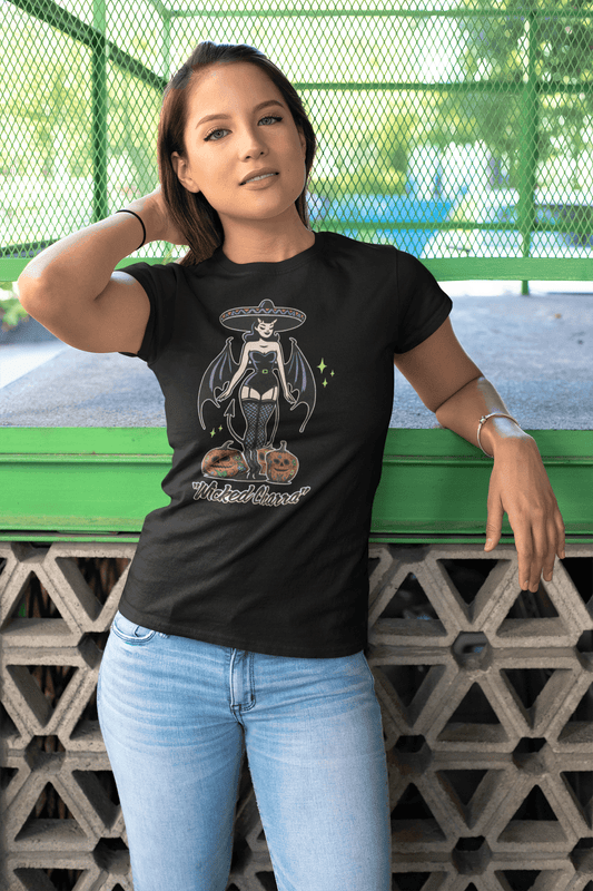 Wicked Charra Women's Halloween & Día de los Muertos T-Shirt – Retro Mexican Pinup Design